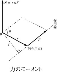 | 剛体を回転させる作用を力のモーメントという。力のモーメントNは、回転の中心からの、力が作用する点までの位置ベクトルrと作用する力Fとのベクトル積で定義される。 N=r×F 剛体がつり合うとは並進運動も回転運動もしないということである。すなわち、剛体のつり合いの条件は、剛体に作用する力の総和(合力)が0だけではなく、力のモーメントの総和も0となる必要がある。従って、剛体のつり合いの条件は、 である。 |